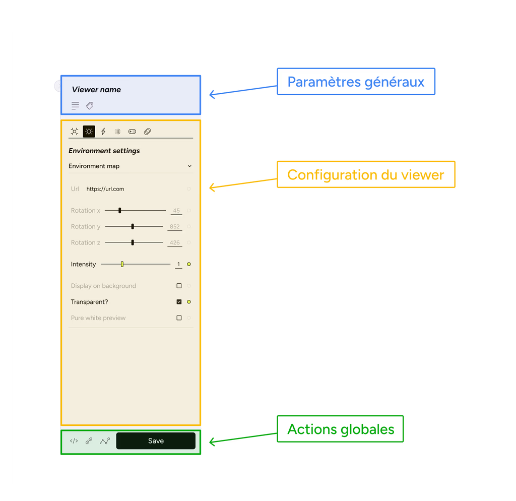 The configurator, which enables the user to customize their 3D viewer (lighting, environment, etc.).