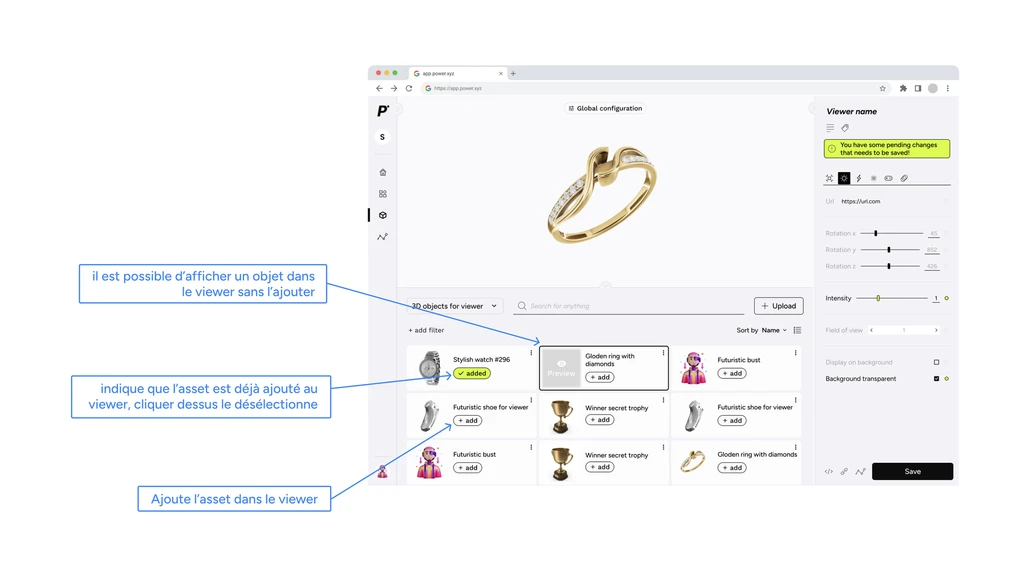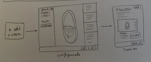 The main problematic was that power.xyz had 3D viewers and a way to edit them but no platform that could allow clients to configurate their viewers themselves. How could I, in the short time we had, design a first version of this module so we could begin quickly its development?